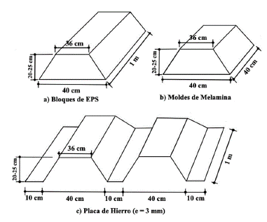 En el estudio económico se encontró que el mercado no cuenta con los moldes de aligeramiento para la losa TVUD, dado que los convencionales no tienen la geometría adecuada para generar la inclinación en el alma de las viguetas, por lo que fue necesario recurrir a diferentes talleres para consultar las opciones de fabricación disponibles en diferentes materiales. El costo de los moldes por unidad y material varía según lo indicado en la tabla 6, mientras que en la figura 8 se indican la morfología y la configuración geométrica de estos elementos.