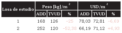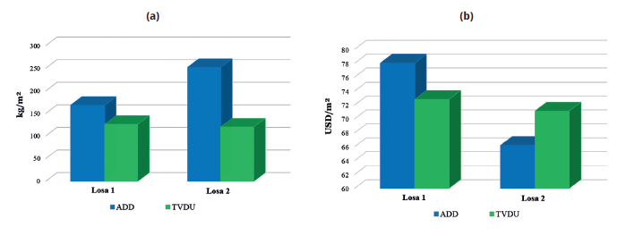 La deflexión en la losa TVUD es menor que la de la ADD, ya que en la primera se emplea un refuerzo de acero más robusto para el soporte de cargas, lo cual proporciona una mayor rigidez al sistema, aspecto que se ve favorecido si se considera que esta tipología es más económica que la ADD, pues a pesar de que el costo del acero es alto, en la losa TVUD el refuerzo se aplica en una sola dirección, a diferencia de las losas bidireccionales, lo cual representa un importante ahorro por metro cuadrado.