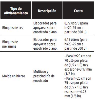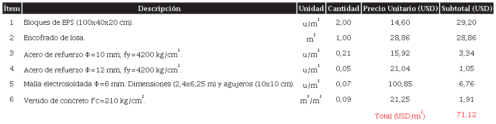 Sin embargo, al comparar la losa con bloque pómez, a pesar de que se obtuvo una excelente reducción en la demanda de acero de refuerzo, se tiene un incremento del costo en un 6,93 % a causa del molde de alivianamiento. Las tablas 9 y 10 muestran el costo de la losa TVDU por metro cuadrado.
