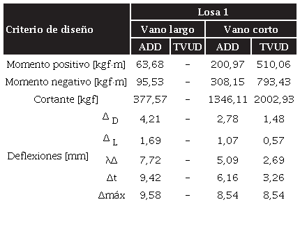 El comportamiento de la losa ADD se basa en la distribución de las cargas hacia las vigas principales, tanto en dirección horizontal como vertical, sufriendo deflexiones en ambas durante su etapa de servicio, mientras que en el sistema TVUD las cargas se transmiten únicamente en la dirección paralela al lado corto, por lo que el momento de flexión se ocasionará principalmente en esta dirección, y, en consecuencia, también las deformaciones, siendo despreciables las que ocurren en la dirección del lado largo. En las tablas 4 y 5 se resumen los resultados de los cálculos.