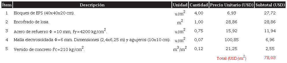 En esta etapa de la investigación se procedió a evaluar el precio unitario de cada uno de los tipos de losa por metro cuadrado. En el cálculo se consideraron rubros que incluyen equipos, materiales y mano de obra. La tarifa de los equipos y el precio de los insumos se consultaron con los proveedores locales, obteniendo de esta manera precios actualizados para octubre de 2023. Sin embargo, en el caso de la losa TVUD no se cuenta con un encofrado disponible para alquilar, ni con los alivianamientos requeridos, por lo que se indagó en los principales talleres de la ciudad su costo de fabricación en diferentes materiales.