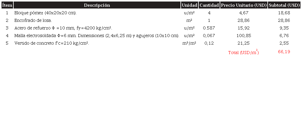 Por su parte, el bloque pómez cada vez tiene menor uso en el país, por sus importantes desventajas estructurales, como mayor peso por metro cuadrado y como agente de agrietamiento durante el tiempo de curado del concreto (debido a que sufre significativos cambios de volumen por dilatación). En las tablas 7 y 8 se muestran el costo por metro cuadrado de las losas ADD#, en las que # representa el número de la estructura en estudio (ejemplo: ADD1 corresponde a la losa de estudio 1).