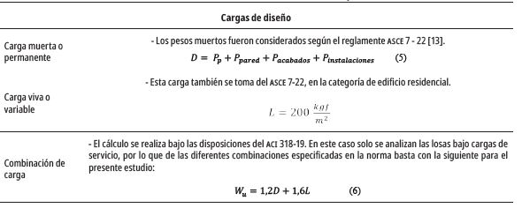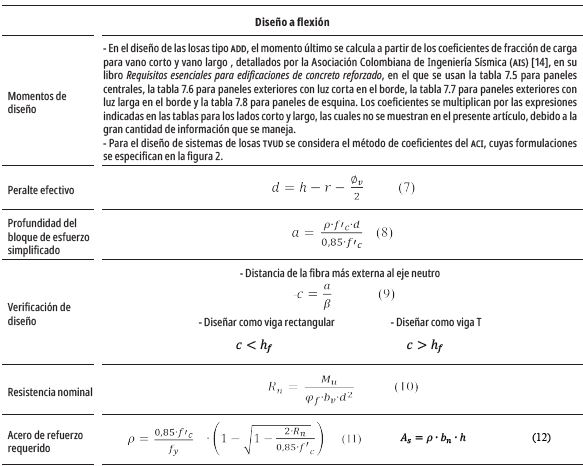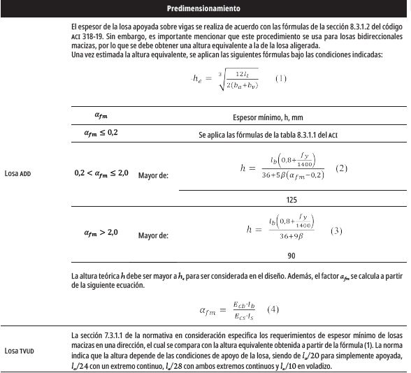 El diseño de las losas se realizó en consideración del código ACI 318-19 [12], además de la consulta de libros basados en sus métodos de cálculo. Estos recursos se usaron tanto en el predimensionamiento de las estructuras, así como en la estimación de las cuantías de acero necesarias para soportar las solicitudes de flexión y cortante. Las ecuaciones utilizadas se especifican en la tabla 1, donde: