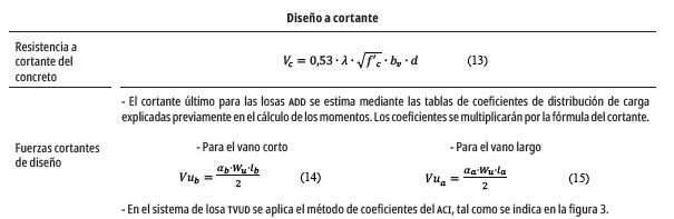 En cuanto al diseño a cortante en ambas tipologías de losa, se identificó que la resistencia del concreto es suficiente para soportar las solicitaciones de carga. En el caso de las losas ADD se estiman los cortantes para los lados cortos y largos del paño crítico, ya que presentan las demandas más altas de carga. Mientras que la losa TVUD se analiza de acuerdo con sus vanos y el tipo de apoyo formado por sus extremos y las columnas.