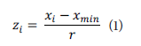 En la que z¡ e es cada uno de los datos normalizados, x¡ es cada uno de los datos, xmin el valor mínimo de x, y r es el rango de los datos evaluados.