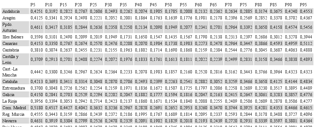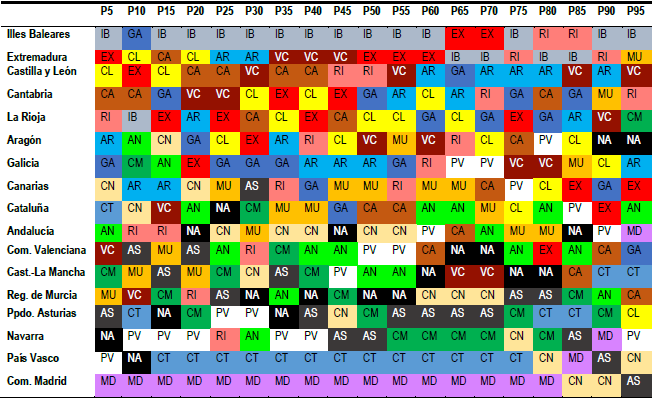 Más interesante, por su carácter comparativo, resulta la estimación del perfil de segregación socioeconómica para cada una de las 17 Comunidades Autónomas de España (figura 2, tabla A1). Sin embargo, el alto número de Comunidades y lo similar de los perfiles hace que la representación gráfica sea poco clara. En todo caso, algunos elementos destacan especialmente: