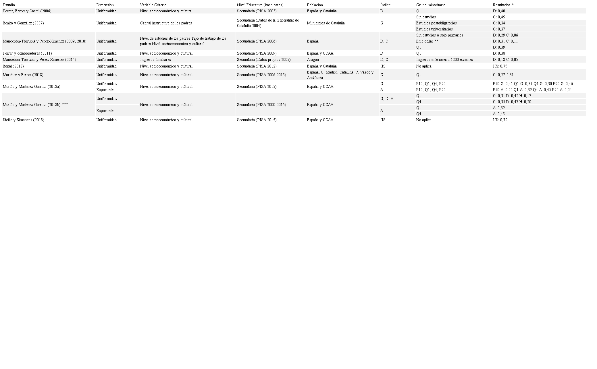 En la tabla 1 se recogen la decena de estudios más importantes que estiman la magnitud de la segregación escolar por nivel socioeconómico en España. Entre sus características diferenciadoras se encuentran: