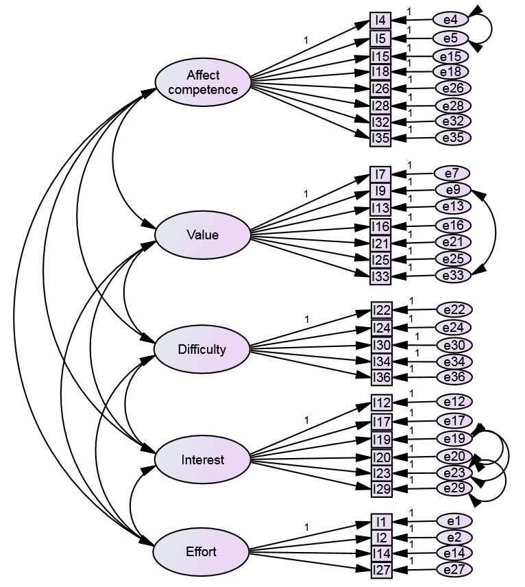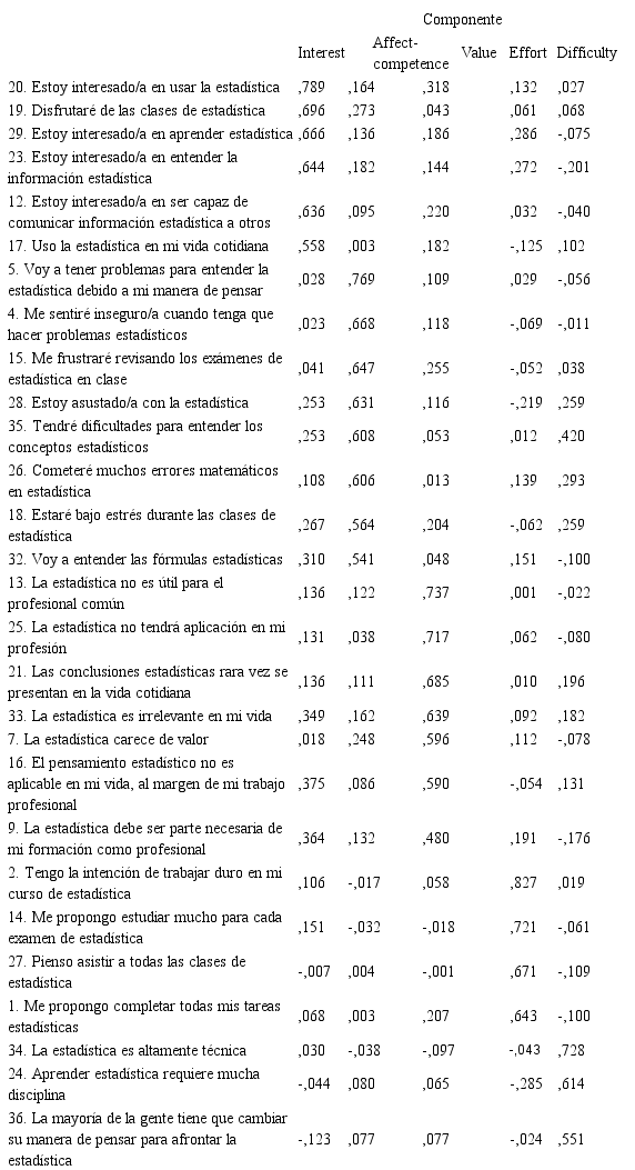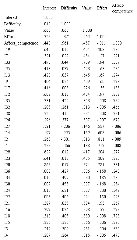 Siguiendo el criterio habitual de retener factores cuyo autovalor es al menos la unidad, el AFE permitió fijar una estructura de cinco factores (Affect-competence, Value, Difficulty, Interest, Effort). Fueron eliminados previamente seis ítems (3, 6, 8, 10, 11 y 31) que o bien no presentaban un nivel adecuado de saturación (r > .40) en ninguno de los factores, o saturaban con nivel alto en más de uno de ellos. Esta estructura es capaz de explicar el 56.12% de la varianza total. De eliminar solo algunos de los seis ítems mencionados, el porcentaje de varianza explicado sería inferior. En la Tabla 1 se recoge la distribución de ítems por cada uno de los cinco factores identificados.