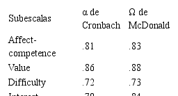 La fiabilidad del instrumento (ver Tabla 4), estimada a partir de α de Cronbach, resulta buena (α >.80) para las dimensiones “Affect-competence” y “Value” y aceptable (α > .70) para “Difficulty”, “Interest” y Effort, de acuerdo con los criterios propuestos por George y Mallery (2003). En cuanto al coeficiente Ω de McDonald, los valores obtenidos podrían considerarse más que aceptables. Alcanzan o superan el .80, con la única excepción de la dimensión “Difficulty”, donde se sitúa en .73.