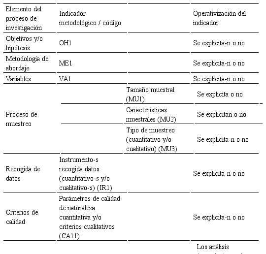 Siendo los trabajos anteriormente mencionados la tendencia general, sí que podemos destacar algunos trabajos relacionados más estrechamente con el presente estudio. Nos referimos concretamente a los trabajos de Bueno y Fernández-Cano (2003), Valenciano et al. (2008), Gómez-García, Ramiro, Ariza y Granados (2012), Ariza & Quevedo Blasco (2015), Rodríguez-Sabiote y Álvarez-Rodríguez (2015), Rodríguez-Sabiote (2017a) y Perales-Palacio, Vílchez-González y Gutiérrez-Pérez (2017). En todos, pero principalmente en los dos últimos, se proponen una serie de indicadores metodológicos relacionados con lo que Arnau, Anguera y Gómez (1990) denominan los niveles técnico-metodológico y estadístico-analítico de los informes empíricos de investigación.