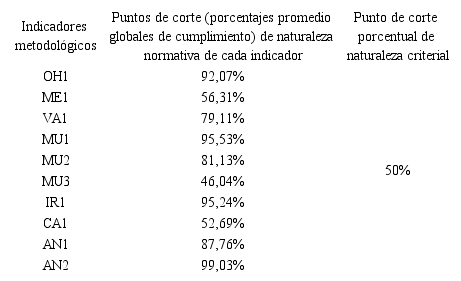 En congruencia con uno de los objetivos específicos de investigación planteados pretendemos comparar los resultados obtenidos por cada uno de los indicadores metodológicos contemplados en cada revista con diferentes puntos de corte de diferente naturaleza (normativa y criterial).