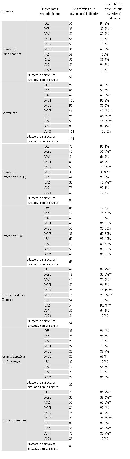 En segundo lugar, a partir de la consideración de los anteriores puntos de corte hemos realizado un estudio comparativo de los porcentajes promedio de cumplimiento de indicadores metodológicos obtenidos por cada revista. Para ello marcamos, o no, cada uno de los porcentajes de artículos que cumplen el indicador en cada una de ellas con asteriscos (uno, dos o ninguno) dependiendo de que su cuantía porcentual esté por debajo o por encima de alguno de los puntos de corte considerados. De esta forma, los porcentajes de artículos que cumplen el indicador metodológico y que constan como no marcados podrían considerarse que han conseguido resultados óptimos de cumplimiento. Por el contrario, los marcados con algún asterisco deberían mejorar en alguna medida, habida cuenta de que si poseen un asterisco significa que están por debajo del punto de corte normativo de cumplimiento de cada indicador individualmente y si ostentan dos es que están por debajo del punto de corte criterial de cumplimiento de cada indicador (50%). Los resultados a este respecto son mostrados a continuación.