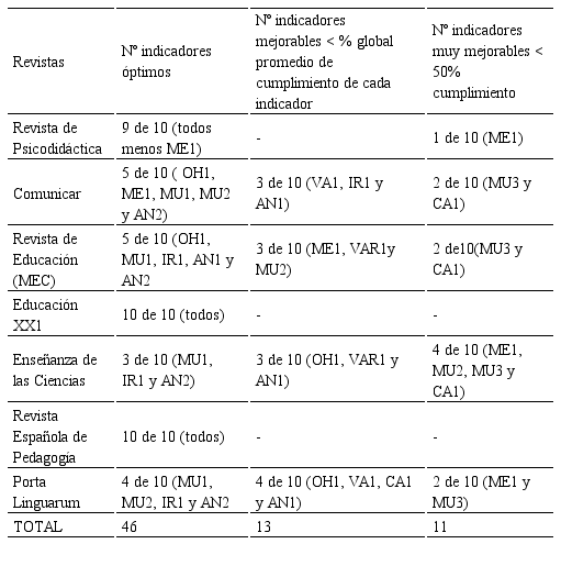Una primera inspección de la Tabla 3 permite constatar la presencia de indicadores metodológicos que ostentan cierta debilidad, aunque con más intensidad en unas revistas que en otras. Por este motivo y con el objetivo de evitar la presencia de un informe farragoso lleno de cifras y comentarios sobre las mismas preferimos presentar una tabla resumen que sintetice los resultados obtenidos por cada una de las revistas objeto de análisis, en relación con los indicadores metodológicos de cumplimiento propuestos.