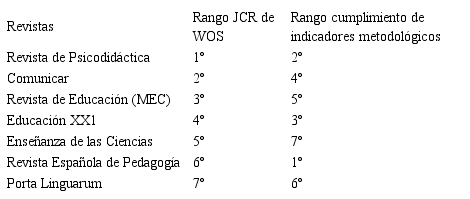 De cualquier forma, sí que existen evidencias empíricas suficientes como para, en el caso particular que nos ocupa, poder afirmar que existe una alta covariación en la clasificación de JCR de WOS y el cumplimiento de indicadores metodológicos de tal forma que cuanto mejor considerada es una revista en JCR también es acreedora de una mejor calidad metodológica, excepto en el caso de la Revista Española de Pedagogía que ha obtenido una alta consideración en calidad metodológica y está peor situada en el ranking JCR de WOS.