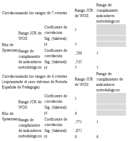 En segundo lugar, hemos calculado el coeficiente de Rho de Spearman (ordinal por ordinal y para muestras reducidas) para tratar de valorar la correlación que puede establecerse entre las dos clasificaciones jerárquicas. Hemos presentado a través de la siguiente tabla (Tabla 6) dos situaciones diferentes. En una primera hemos correlacionado los rangos teniendo en cuenta todas las revistas, pero dado que el caso de la Revista Española de Pedagogía es tan extremo (6º vs 1º) hemos también recalculado el coeficiente de Rho de Spearman suprimiendo el dicho caso extremo. Los resultados son los que mostramos a continuación.