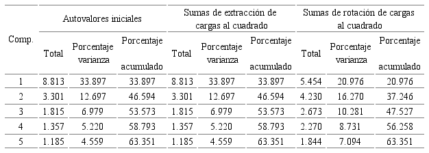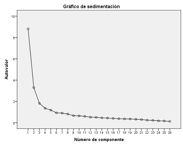 La representación gráfica de la estructura factorial en cinco factores y los valores propios (figura 1), muestra que el cambio de pendiente de la curva se produce a partir del quinto factor, acumulando el 63.351% de la varianza total.