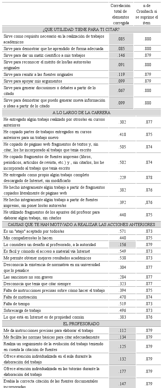 Posteriormente, se procedió al análisis de la capacidad de discriminación de los ítems, a través del cálculo del índice de homogeneidad, definido como el coeficiente de correlación de Pearson entre la puntuación en el ítem y la suma de las puntuaciones en los restantes ítems. Resultado de ello, fueron eliminados 17 que mostraban valores inferiores a .2 (tabla 2), es decir, el ítem Lo considero un desafío al profesorado, a la autoridad de la dimensión Causas que te han motivado a realizar las acciones anteriores y todos los correspondientes a la dimensión ¿Qué utilidad tiene para ti citar? y El Profesorado...