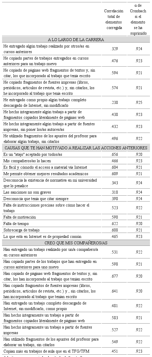 De este modo, tras la eliminación de dichos ítems, el cuestionario queda reducido a un total de 30 frente a los 50 iniciales y a tres dimensiones A lo largo de la carrera… (8 ítems), Causas que te han motivado a realizar las acciones anteriores (12 ítems) y Creo que mis compañeros/as… (10 ítems). Esta reducción considerable en el número de ítems guarda coherencia con el marco teórico sobre el plagio puesto que las dimensiones e ítems que han sido eliminados, si bien tienen relación con el constructo a estudiar, no aluden específicamente al plagio, sino a otros elementos relacionados, tales como las acciones para no cometer plagio y la importancia de citar.