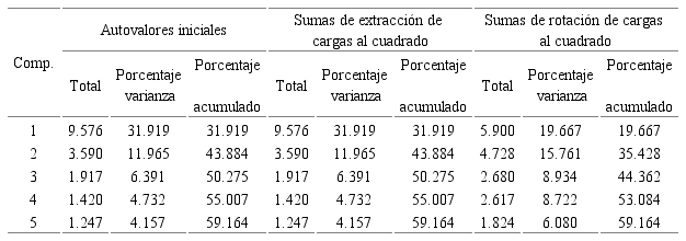 Como se puede observar, en la tabla 4, en la que se recogen los porcentajes de la varianza total del modelo antes y después de la rotación, no se han producido cambios en la varianza total explicada para los cinco primeros componentes, siendo en ambos casos del 59.164%, con valores superiores a 1. No obstante, sí se producen modificaciones en la parte explicada de manera individual por cada componente o factor, ya que, a raíz de la rotación el 31.919% correspondiente al primer factor sin rotar, pasa a ser del 19.667%, el 11.965% del segundo factor al 15.761%, el 6.391% frente al 8.934% del tercer factor y el 4.732% y 4.157% del cuarto y quinto factor pasa al 8.722% y 6.080% de la matriz rotada respectivamente.