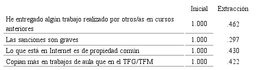 El análisis de las comunalidades, muestra que la mayoría de los ítems están bien explicados por la estructura factorial, a excepción de He entregado algún trabajo realizado por otros/as en cursos anteriores (comunalidad= .462), Las sanciones no son graves (comunalidad=.297), Lo que está en Internet es de propiedad común (comunalidad=.430), Copian más en trabajos de aula que en el TFG/TFM (comunalidad=.422) que tienen valores inferiores a .50. Estos cinco ítems son eliminados pues carecen de una explicación suficiente y no deberían ser considerados en la interpretación final del análisis (Zamora, Monroy, & Chávez, 2009), quedando el cuestionario configurado por un total de 26 ítems, se llevó a cabo un segundo análisis factorial para confirmar su comportamiento en las dimensiones establecidas.