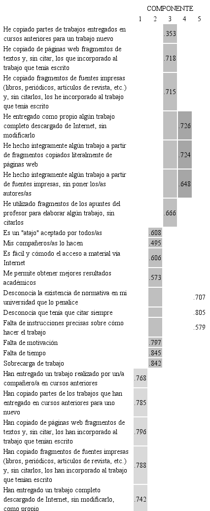 El quinto factor, que explica el 7.094% de la varianza, agrupa algunos ítems del bloque Causas que te han motivado a realizar las acciones anteriores: Desconocía la existencia de normativa en mi universidad que lo penalice. Desconocía que tenía que citar siempre y Falta de instrucciones precisas sobre cómo hacer el trabajo. Estos ítems se pueden englobar bajo la categoría causas externas del plagio.