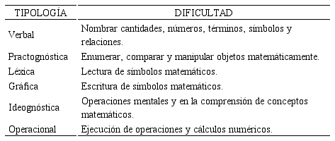 En 1974, Kosc propuso el término discalculia por primera vez. Definió la discalculia como un trastorno diferenciado de otras alteraciones matemáticas, destacando su heradabilidad y/o afección congénita del sustrato cerebral responsable de las funciones matemáticas. Así mismo, establece distintas tipologías (ver Tabla 1).