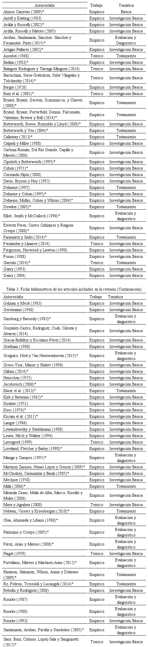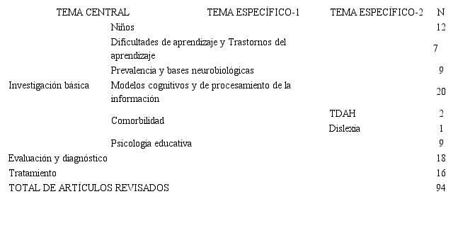 Una vez elegidas las palabras clave, se seleccionaron los artículos en base a los criterios especificados anteriormente. Los contenidos de esta revisión se relacionan directamente con el objetivo general definido al inicio del método. Como se puede ver en la Tabla 2 (y en la Tabla 3 más abajo), la mayoría de los artículos consultados se centran en investigación básica, seguido por evaluación y diagnóstico, y tratamiento. El tema específico-1 se refiere a artículos en los que se tratan de forma más acotada los trastornos del cálculo. Finalmente, el tema específico-2 menciona la discalculia de forma secundaria.