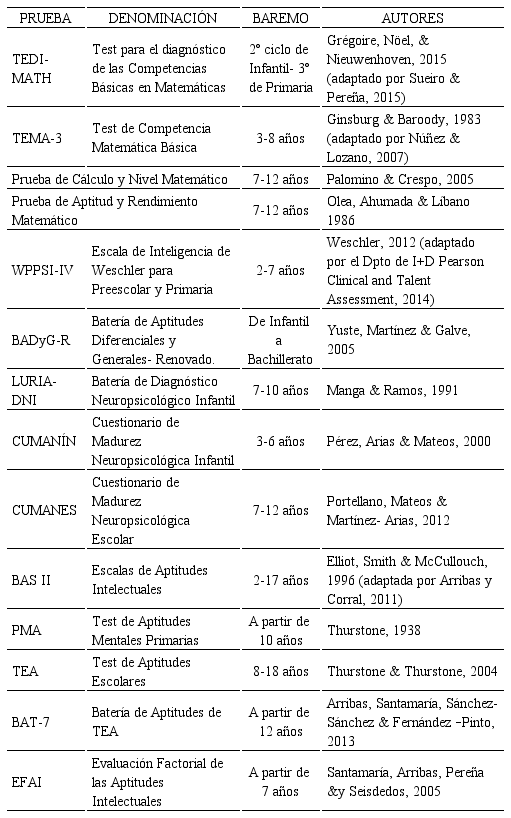 El diagnóstico de la discalculia (como el de otras DA) es clínico (APA, 2000, 2013). Esto requiere recoger datos de la historia clínica del alumno, así como la revisión de informes escolares y contacto con el servicio de orientación de la escuela. Paralelamente, se llevará a cabo una evaluación neuropsicológica a través de pruebas estandarizadas (ver Tabla 4), de cara a establecer cuáles son las dificultades, valorar las funciones cognitivas alteradas y preservadas, detectar la presencia de posibles déficits asociados y hacer un diagnóstico diferencial. Por tanto, esta evaluación incluirá pruebas que evalúen el cociente intelectual, los procesos lectoescritores y los procesos psicológicos básicos (Barrachina et al., 2014), dado que la capacidad de cálculo es multifactorial (Ardila et al., 2005). Todos estos datos se valorarán de cara al establecimiento de un tratamiento educativo lo más ajustado posible. Actualmente, son pocos los instrumentos estandarizados para la detección y diagnóstico de los trastornos del cálculo en España, especialmente para Secundaria y Bachillerato. Algunos de los test para detectar y diagnosticar trastornos del cálculo en España se recogen en la siguiente tabla fruto de la revisión bibliográfica del presente trabajo (Tabla 4), donde es importante destacar que en ciertos casos (como en pruebas de aptitud académica y rendimiento intelectual) se suelen emplear subpruebas de escalas más generales (por ejemplo, en la WPPSI-IV).