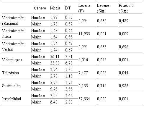 En primer lugar, y sobre los descriptivos básicos de la muestra de estudio, pudo observarse que los varones sufrían en mayor medida victimización física que las chicas, sin encontrar asociaciones estadísticamente significativas para la victimización física y verbal. Estos hallazgos pueden ser justificados por Ferguson (2015), quien señala las agresiones de tipo físico entre pares de sexo masculino como un medio para reforzar la autoestima, gestionar emociones negativas o incluso socializar. Asimismo, los niños veían más la televisión y jugaban más a los videojuegos que las niñas, datos que concuerdan con lo mostrado por Boxer et al. (2015), quienes atribuyen esta tendencia a la mayor existencia de dispositivos con un contenido que culturalmente ha sido asociado al género masculino. Por otro lado, el mayor uso de dispositivos digitales por parte de varones puede ser justificado también por una mayor búsqueda de recompensas externas a través del reforzamiento-recompensa que brinda el videojuego, lo que podría fundamentar los mayores niveles de irritabilidad encontrados para el género masculino (Chacón et al., 2017; Ditrrick et al., 2013).