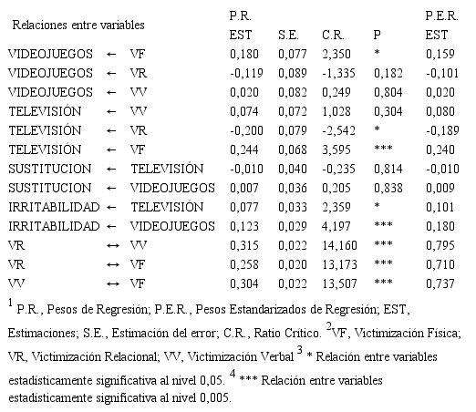 Se observan asociaciones estadísticamente significativas al nivel 0,005 entre todas las dimensiones de victimización, siendo todas ellas positivas y directas. Se muestra una relación directa en el uso de televisión con la victimización física (p < 0,005; r = 0,240), mientras que la asociación es inversa con la victimización relacional (p < 0,05; r = -0,189). Asimismo, se observan relaciones estadísticamente significativas entre victimización física y videojuegos (p < 0,05; r = 0,159), el uso de televisión y la irritabilidad (p < 0,05; r = 0,101) y el uso de videojuegos con esta misma variable (p < 0,05; r = 0,180), todas ellas positivamente relacionadas. Destacar que no se observaron diferencias estadísticamente significativas en las relaciones dadas entre videojuegos y victimización relacional y verbal, así como la sustitución de actividades con el uso de televisión y videojuegos. En los casos en los que no se encuentran asociaciones estadísticas se obtienen valores inferiores a 2 en el ratio crítico (C.R.), ya que los superiores suponen que el parámetro es diferente de 0 de forma estadísticamente significativa (Byrne, 2013). De este modo, puede establecerse que las escalas empleadas en las variables mencionadas no presentan validez convergente.