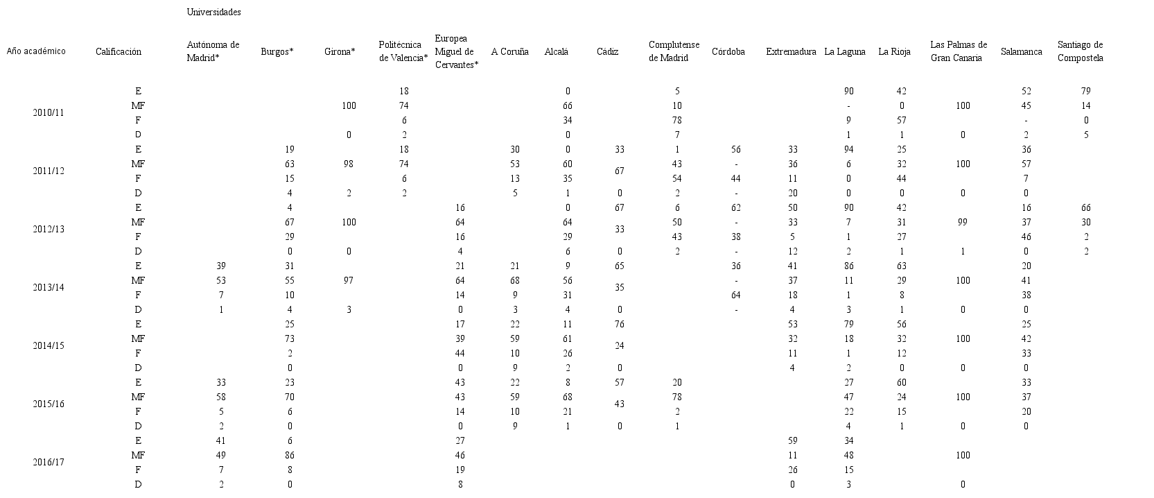 Nota: en algunas Universidades/años la suma de porcentajes no resulta 100% exacto debido bien a redondeo bien a que no se incluye en los porcentajes publicados al profesorado excluido de la evaluación