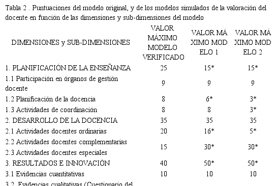 Así, en el primer modelo simulado (Modelo 1), tal y como se ilustra en la Tabla 2, la sub-dimensión Planificación de la docencia (1.2) pasa a tener un máximo de 6 puntos en lugar de 8. Y el máximo de esta dimensión 1 (Planificación de la enseñanza) queda disminuido a un máximo de 15. En la misma línea, la dimensión 2 Desarrollo de la docencia, mantiene su peso; sin embargo, la sub-dimensión de Actividades docentes ordinarias (2.1) baja a 16 puntos en lugar de 20, mientras que las Actividades docentes complementarias y especiales (2.2 y 2.3) elevan conjuntamente su valor máximo a 30 en lugar de 15. Finalmente, haber disminuido en 10 puntos la dimensión 1 Planificación de la enseñanza permitió aumentar la magnitud de la dimensión 3 Resultados e Innovación, pudiendo así alcanzarse un máximo de 50 puntos, en lugar de los 40 con el Modelo verificado. La sub-dimensión Evidencias cualitativas (3.2) aumenta su tope de 20 a 25 puntos y Formación e innovación (3.3) junto aotros méritos (3.4) pasa de 10 a 20 puntos máximos.