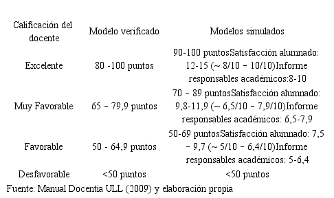 Otro aspecto que consideramos necesario revisar era el relativo al informe de los responsables académicos y la encuesta del alumnado sobre la docencia recibida. Esta última, actúa en el Modelo verificado como requisito para la inclusión del profesorado en una cierta categoría evaluativa. El buen desempeño del profesorado ha de traducirse necesariamente en la satisfacción que genera, principalmente en su alumnado. De hecho, en el contexto del EEES la herramienta básica de evaluación del desempeño docente es la encuesta de satisfacción al alumnado (Pozo Muñoz et al., 2011).