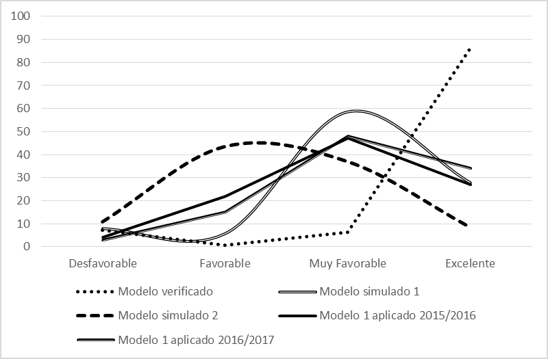 En la Figura 2 se compara la distribución de la calificación del profesorado en cada uno de los modelos simulados con los datos reales del Modelo verificado y los datos obtenidos en la aplicación del modelo alternativo (Modelo 1) en las convocatorias 2015/16 y 2016/17. Se aprecia cómo los resultados reales obtenidos con la implementación del Modelo 1 se acercan a la distribución del Modelo 1 simulado, fundamentalmente en lo que a las categorías de “Excelente” y “Muy favorable” se refiere. Además, ponen de manifiesto la capacidad para discriminar de forma más adecuada entre el profesorado “Favorable”, “Muy favorable” y “Excelente”.