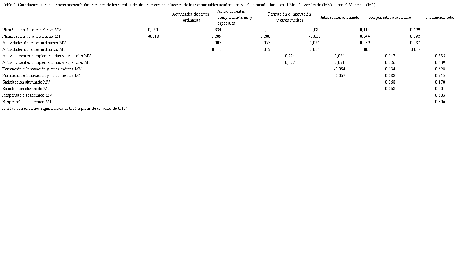 El Modelo Docentia asume que las tres fuentes de información para la evaluación del profesorado son independientes, esto es, no son redundantes. Para examinar este extremo, hemos correlacionado la Satisfacción del alumnado, la Satisfacción de los responsables académicos y varias dimensiones/sub-dimensiones referidas a los méritos del profesor: Planificación de la enseñanza, Desarrollo de la docencia y la sub-dimensión de Formación e innovación, tanto en el Modelo verificado, como en el Modelo 1 (que se implementó). Las correlaciones se muestran en la Tabla 4.