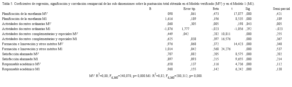 A efectos de conocer el peso de los méritos del docente, así como de la satisfacción del alumnado y de los responsables académicos en la puntuación total obtenida, hemos llevado a cabo análisis de regresión lineal, tanto para el Modelo verificado, como para Modelo 1 (Tabla 5).
