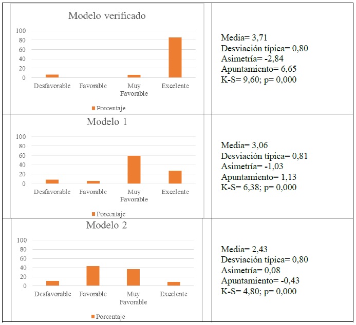 En la Figura 3 se representan las distribuciones e indicadores de síntesis de las distintas dimensiones y sub-dimensiones en función del Modelo Verificado, Modelo 1 y Modelo 2 obtenidos mediante la aplicación del cambio de criterios presentado en el procedimiento.