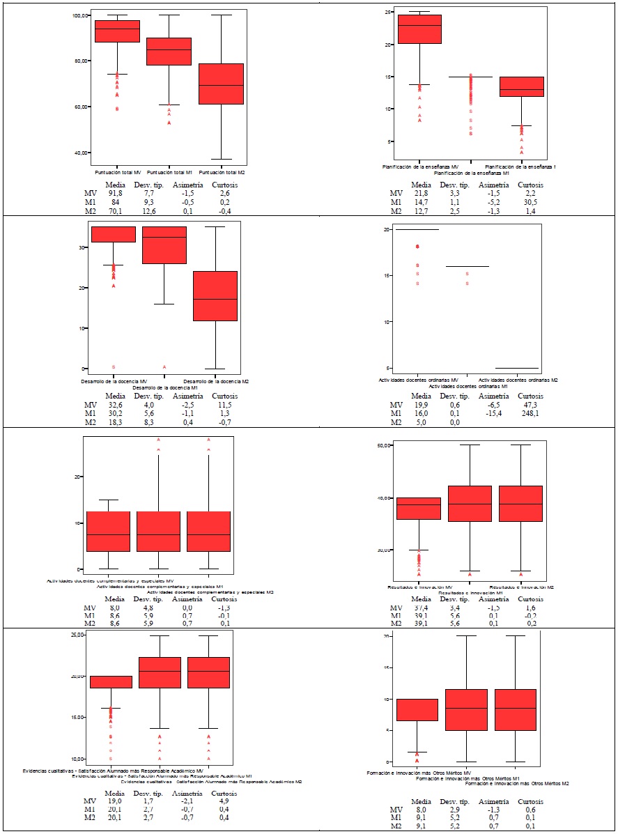 Puede observarse que la distribución de la puntuación total, aumenta su variabilidad, disminuyendo su media, asimetría y curtosis. La primera dimensión, Planificación de la enseñanza (actividades obligatorias), recibe un efecto techo de 15 puntos. La dimensión 2, Desarrollo de la docencia, también aumenta su variabilidad, disminuyendo su media, asimetría y curtosis. Está compuesta por las sub-dimensiones Actividades docentes ordinarias, que reciben un techo de 16 o 5 puntos según qué modelo y Actividades docentes complementarias y Actividades especiales, que consiguen aumentar su media y variabilidad. La dimensión 2, Resultados e Innovación, aumenta su rango de puntuaciones, incrementando ligeramente su media y aumentando su variabilidad. Su sub-dimensión Evidencias cualitativas aumenta su rango, en la misma línea que las sub-dimensiones Formación e innovación y otros méritos, que eleva su variabilidad y su media al incrementar su techo conjunto