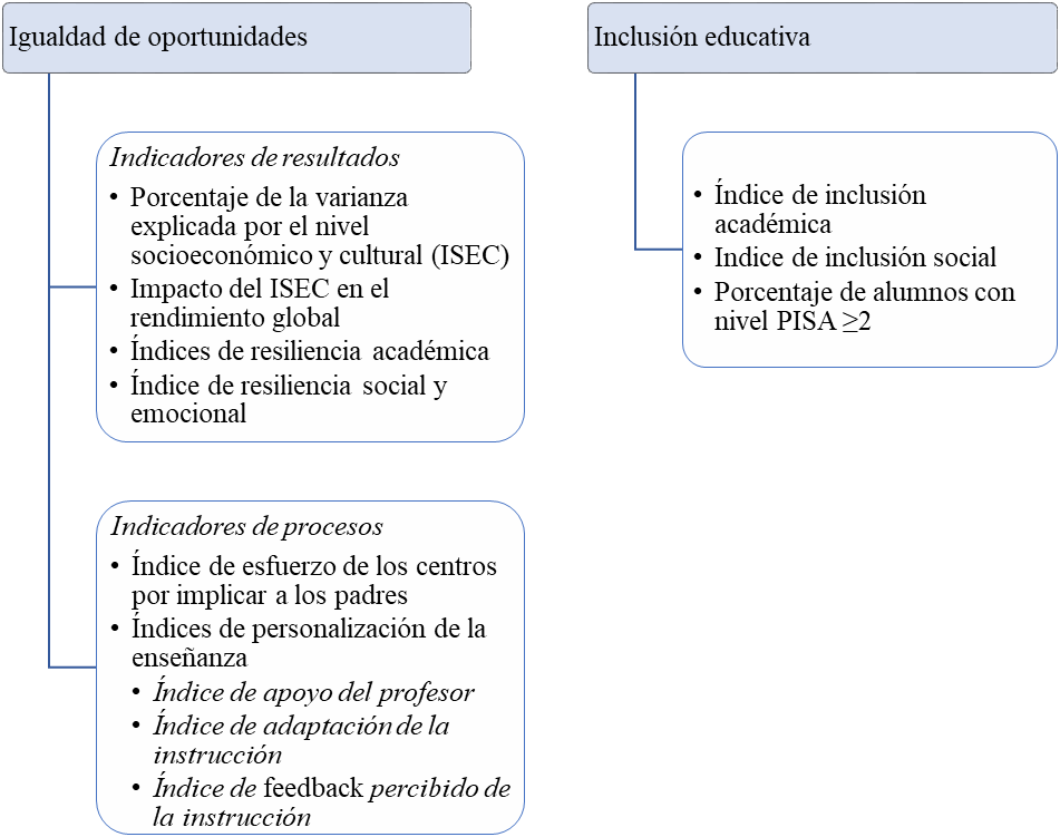 La selección del conjunto de indicadores que se enumeran en la Figura 1 añade a los cuatro indicadores de resultados de igualdad de oportunidades establecidos por PISA 2015 (OECD, 2016a), dos indicadores de procesos cuya relevancia potencial, empíricamente fundada, ha sido descrita más arriba: