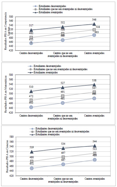 Del análisis de la colección de gráficas recogidas en la Figura 2 se infiere que el patrón de asociación del rendimiento con el grado de desventaja social a nivel de centro y de alumno, es similar en cada una de las tres áreas PISA.