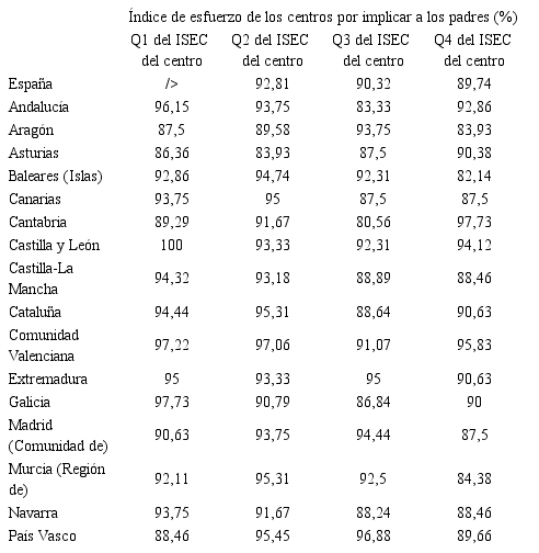 En lo que concierne al segundo grupo de indicadores de procesos, y de conformidad con nuestro marco conceptual, resulta de interés analizar si las políticas que promueven la implicación de los padres -tanto en la marcha del centro como en el progreso escolar de sus hijos- resultan más acentuadas en aquellos centros que más lo necesitan, con el fin de hacer efectivo uno de los mecanismos que operan sobre el esfuerzo de los alumnos mediante la modificación de sus circunstancias personales. La Tabla 5 presenta los valores del índice de esfuerzo de los centros por implicar a los padres, según el nivel socioeconómico del centro y por comunidades autónomas. El comportamiento de España en su conjunto indica que ese esfuerzo de los centros resulta tanto mayor cuanto menor es el orden del cuartil. No obstante, se aprecia que en algunas comunidades autónomas ese comportamiento deseable como elemento de compensación no está presente. Tal es el caso de Asturias, Cantabria o el País Vasco. En el extremo opuesto es de destacar Castilla y León y La Rioja en donde el índice alcanza un valor del 100,00% para los alumnos del Q1.