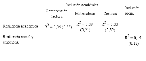 El análisis de regresión lineal entre el índice de resiliencia académica y el índice de inclusión académica para cada una de las tres áreas PISA revela, de forma consistente, la ausencia de una relación estadísticamente significativa entre ellas. No obstante, cálculos realizados a partir de los datos de PISA sobre los rasgos de los alumnos académicamente resilientes indican que la resiliencia también se da en una proporción apreciable en centros en desventaja social; o, dicho de otro modo, que, con respecto a la resiliencia académica basada en niveles de rendimiento, la desventaja social del centro no resulta totalmente determinante para los alumnos socialmente desaventajados. Esta conclusión, resulta compatible con la debilidad de la relación entre resiliencia e inclusión observada en los antes citados análisis de regresión (Tabla 7) y apunta a dos posibles factores intervinientes.