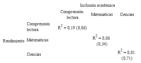 Finalmente, los análisis de regresión entre los índices de inclusión académica y de inclusión social muestran que tales variables no están relacionadas entre sí. Su coeficiente de determinación = 0,02 es extremadamente débil y la relación entre ambas variables es estadísticamente no significativa (sig. = 0,60). En el apartado de Discusión ampliaremos los razonamientos a este respecto.