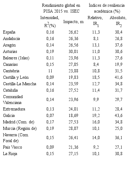 En el presente estudio la utilización de los índices de resiliencia académica se ha visto enriquecida por dos circunstancias específicas de nuestro trabajo: la introducción de una aproximación territorial por comunidades autónomas, siguiendo un esquema análogo al que emplea PISA para los países, y la referencia en los cálculos correspondientes a la puntuación global para cada uno de los dos índices de resiliencia e y no simplemente a la del área de Ciencias.