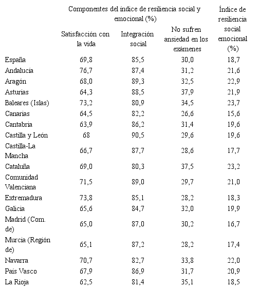 En la Tabla 2 se muestran los valores del índice de resiliencia social y emocional, y su desagregación en sus tres componentes. En lo que concierne a este indicador, la puntuación total de España es de 18,7%, siendo Baleares (23,7%) y Cataluña (23,2%) las comunidades autónomas que obtienen mejores resultados; y Canarias (15,6%) y la Región de Murcia (17,4%) las que obtienen los peores. No obstante, cuando se analizan las contribuciones por componentes se evidencia que, en el segundo componente –integración social del alumno en el centro educativo–, que es el más claramente vinculado con el sistema escolar, la ordenación anterior cambia notablemente. Sobre este extremo volveremos en la Discusión.
