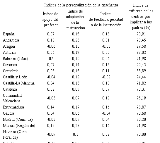 Por la naturaleza de los ítems en los que reposa su medida, el índice de apoyo del profesor constituye una primera aproximación al grado de personalización de la enseñanza de las Ciencias cuyos resultados se muestran en la Tabla 3. España presenta una puntuación de 0,07, positiva y por tanto por encima de la media de la OCDE (0,00), situándose en este caso Andalucía (0,18) y la Región de Murcia (0,15) en las posiciones de cabeza y País Vasco (-0,13) y Navarra (-0,09) en las de cola.
