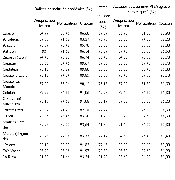 Con la intención de disponer de una información más completa que la ofrecida por PISA 2015 para los países participantes, en este estudio se han calculado los índices de inclusión académica para cada una de las tres áreas y no solamente para la de Ciencias. La Tabla 4 muestra los valores resultantes por comunidades autónomas, junto con el total nacional. De su análisis se infieren los siguientes hechos:
