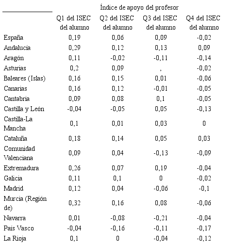 En relación con los indicadores de procesos, cabe fijar la atención, en primer lugar, en los tres indicadores de personalización de la enseñanza considerados en nuestro estudio. En lo que respecta a los análisis por cuartiles del ISEC, de la Tabla 5 se infiere un comportamiento razonable para el índice de apoyo del profesor, en el total de España, en el sentido de que para el valor del índice, con un 0,19, es el máximo de la distribución y además positivo, con una diferencia positiva con respecto al cuarto cuartil de 0,35, lo cual indica un tratamiento diferenciado en favor de los alumnos en desventaja social. El análisis por comunidades autónomas no revela ningún comportamiento anómalo, por invertido, pero cabe no obstante destacar los casos del País Vasco y de Castilla y León que presentan valores negativos para y se sitúan por tanto por debajo de la media global de este índice para los países de la OCDE.