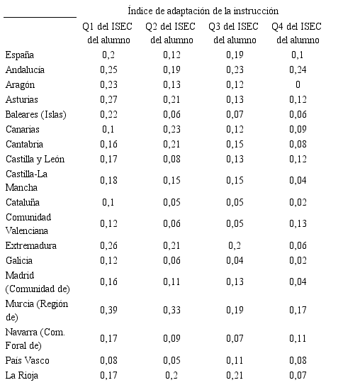 En lo relativo al índice de adaptación de la instrucción, el estudio del comportamiento de las cifras del total de España indica de nuevo un valor del índice para el primer cuartil igual a 0,20 con una diferencia entre el primer cuartil y el cuarto de 0,10. Este comportamiento, aunque razonable en el sentido de que la enseñanza de las Ciencias se hace ligeramente más adaptativa en los alumnos socialmente desfavorecidos, presenta un recorrido de mejora particularmente amplio en el País Vasco, Cataluña y Canarias.