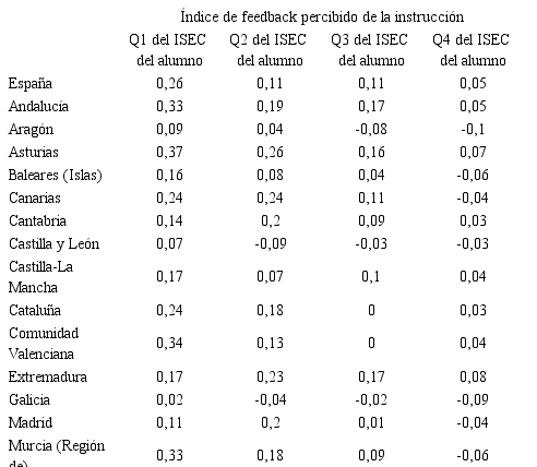 Para el índice del feedback percibido de la instrucción, los resultados que se obtienen sobre el primer cuartil son de 0,26 para el total nacional, con una diferencia apreciable entre el primer y el cuarto cuartil de 0,21. Asturias (0,37) y la Comunidad Valenciana (0,34) se sitúan en posiciones de cabeza, en relación con el valor de este índice para los alumnos del , mientras que el País Vasco y Galicia se sitúan en posiciones de cola en la comparación nacional (véase la Tabla 5).